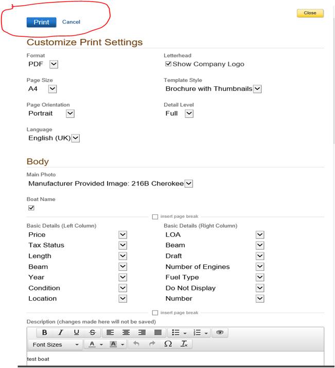 5. From here you can select the options you wish to show on your printed specification, you can update the template style, detail level from basic to full and when you are happy with the information you wish to show on the print, please click on “Print” to print your spec.